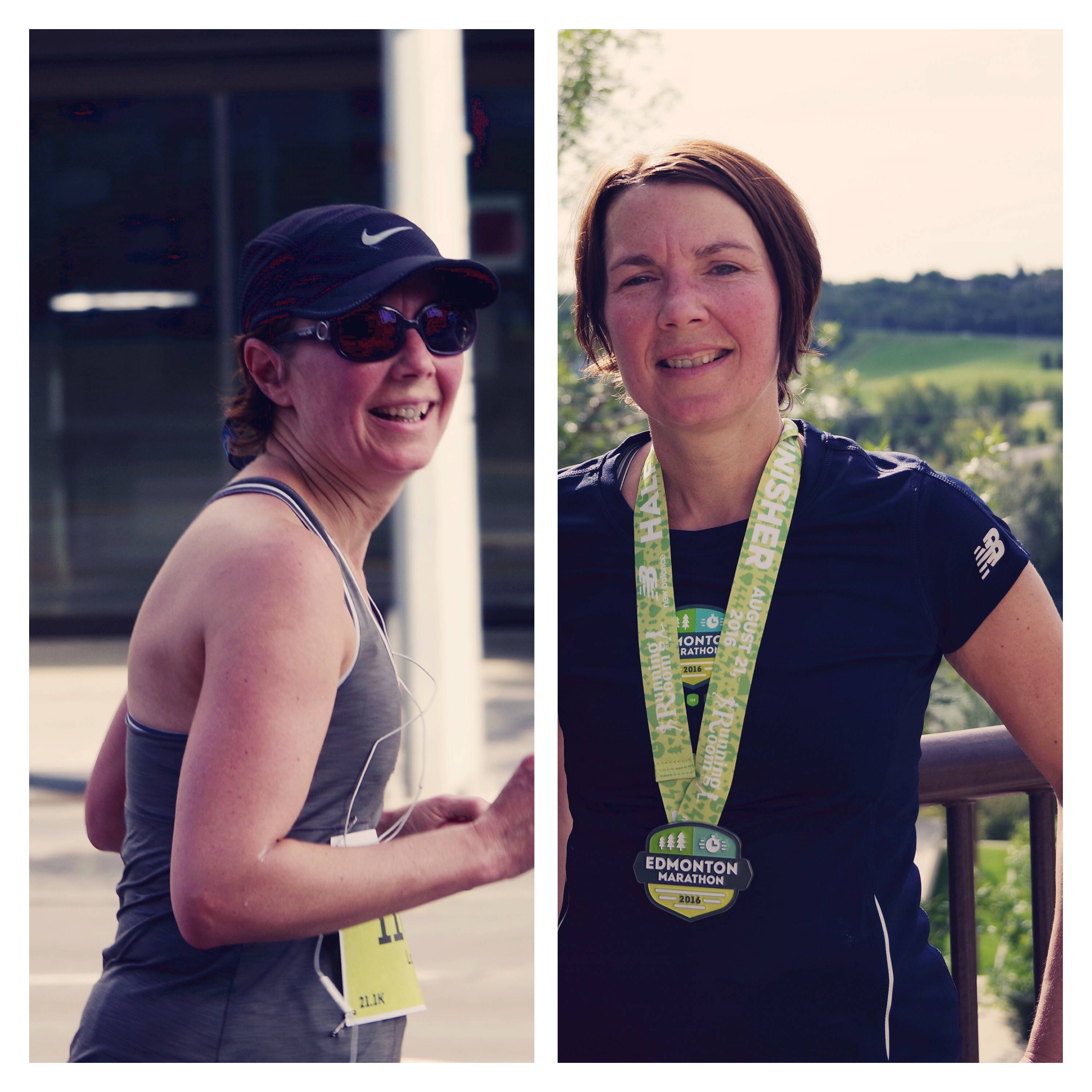 Her “tapering” prior to the race included drinks on various outdoor decks during the week and attending the excellent play, “Prepare for the Worst” (foreshadowing) at the Fringe festival with a friend from U of A, having dinner at The Manor Bistro the night before the run, and walking down to the N Saskatchewan 🙂