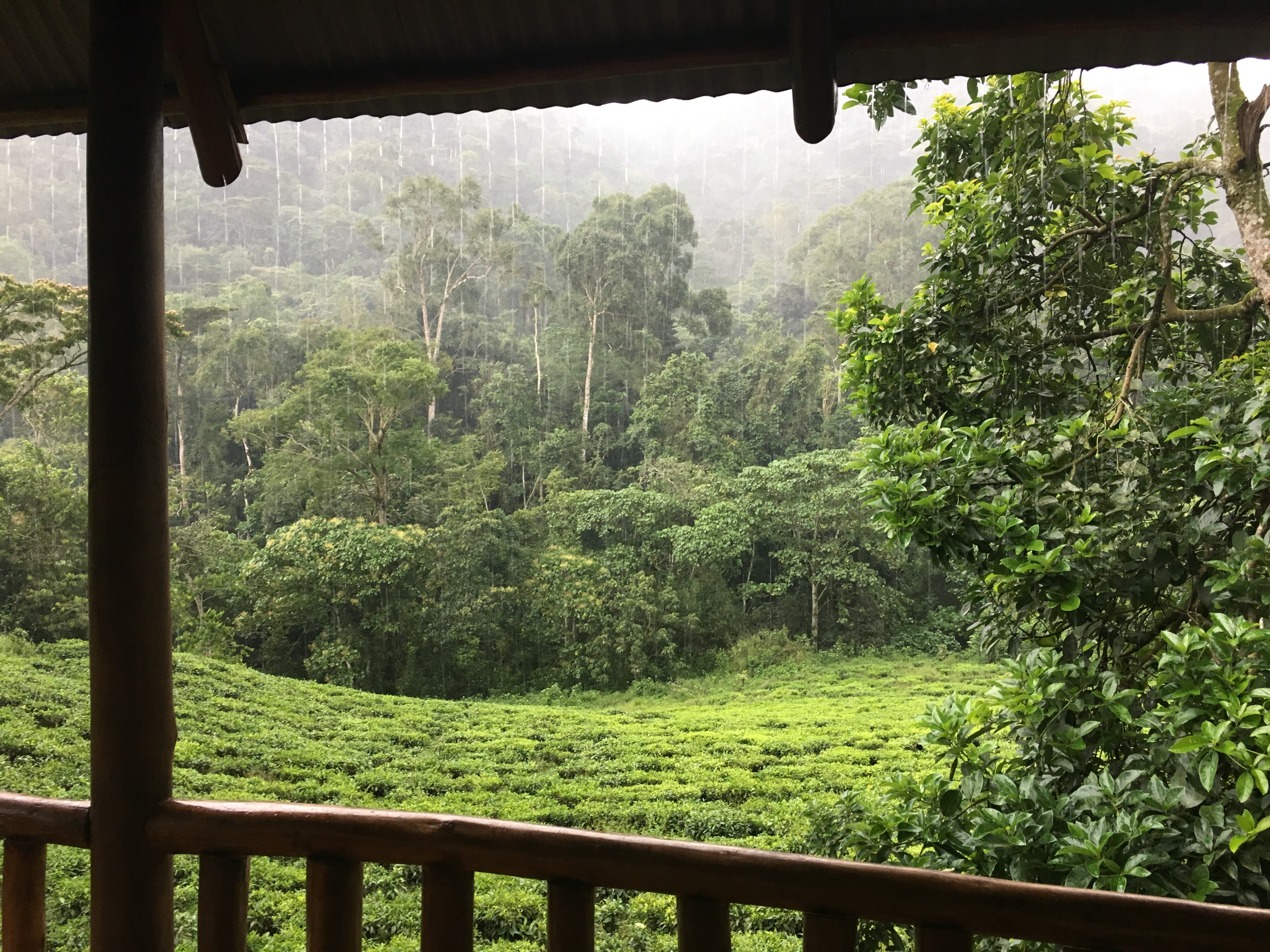 Our accommodation – the Gorilla House – is right on the edge of the Bwindi Impenetrable Forest and it does almost feel as though we are living in a fairy tale with a massive rose bush climbing up and over the entry way; a deck overlooking the forest; and the air positively thrumming with bird, insect, and flowing water noise as well as drumming from the Batwa Development Project Centre at 4:30 pm most days. Because it is near the equator, the sun rises at about 6:30 am and sets at 6:30 pm, with more twilight than Zimbabwe but much less dramatic sunrises and sunsets. It rains daily, impressively torrential at times, with accompanying thunder and lightning. The absolute contrast with the drought in Zimbabwe is distressing. The humidity affects everything, e.g. toilet paper doesn’t tear properly, a piece of paper can’t be torn along a crease, and our pack of Wizard cards feels disturbingly clammy. Laundry takes days not minutes to dry.