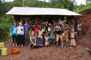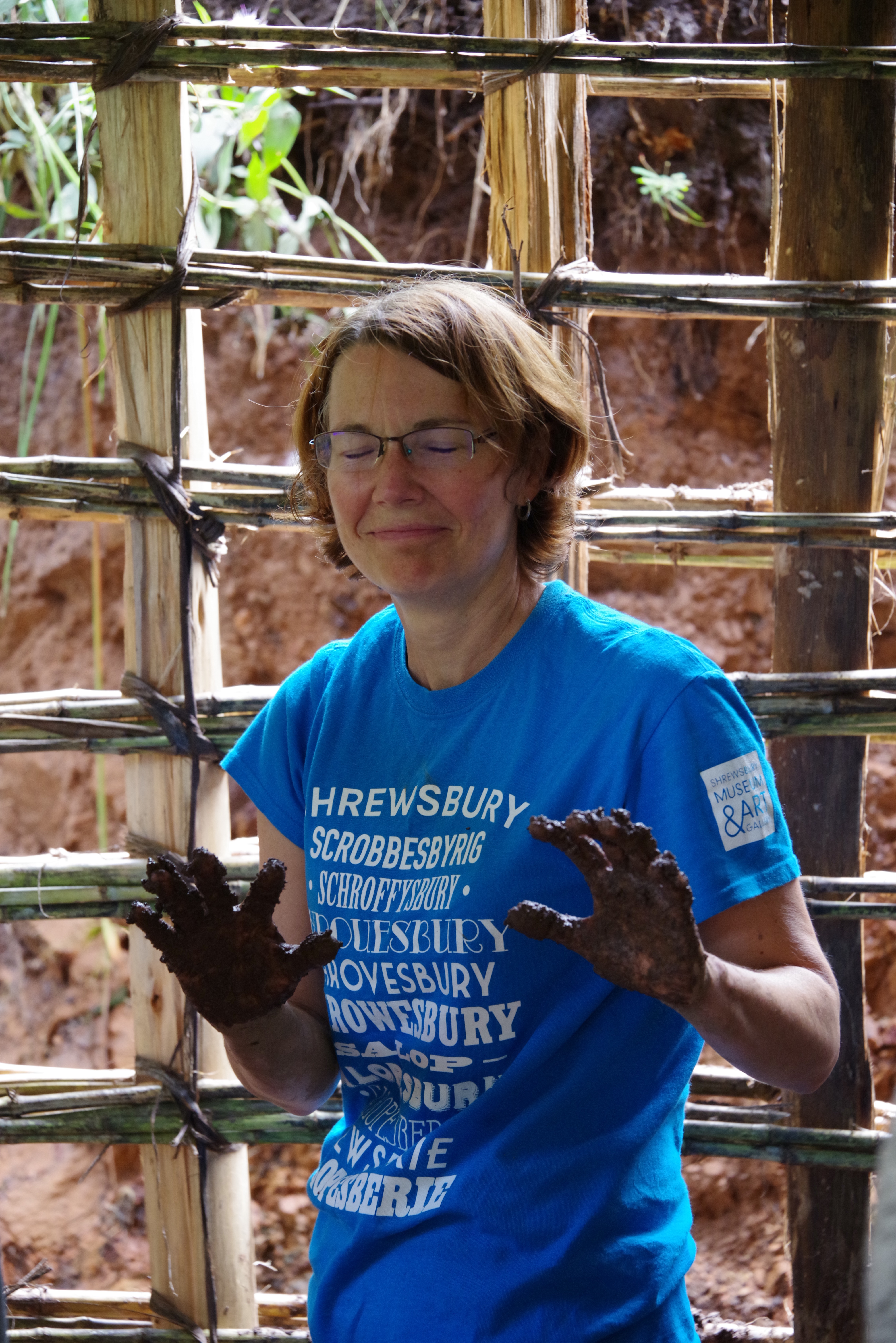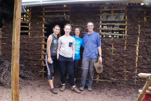 With funding from the North Peace Division of Family Practice, on Friday we helped mud a hut with the Batwa Development Project. It was great to have two Americans along with us as it meant we got over half the hut mudded in the allotted time. It was a challenge for me. My running partners know I don’t even like to run through mud let alone get my hands and clothing smeared with it. The local population worked hard alongside and provided us with a meal of goat, millet bread, and tomato sauce.