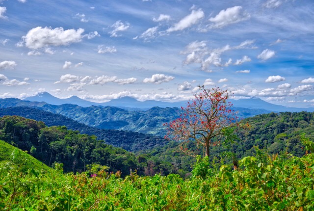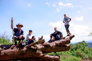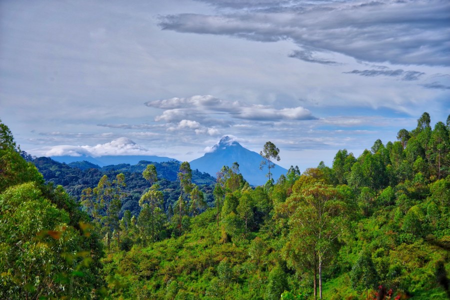 Sunday we went for a hike with a local guide and the standard side-kicks of a policeman and a park ranger. We keep being told that the armed ranger or policeman needs to be along in case there are elephants though how an elephant would maneuver through the Impenetrable Forest we’re not sure. We were fortunate that it was the clearest day we had experienced since arriving and the panoramic views were superb. At one point we could see the dormant volcanoes in Rwanda and the Great Rift Valley as it coursed up through the Congo. Indeed the trail we were on ducked briefly into the Congo.