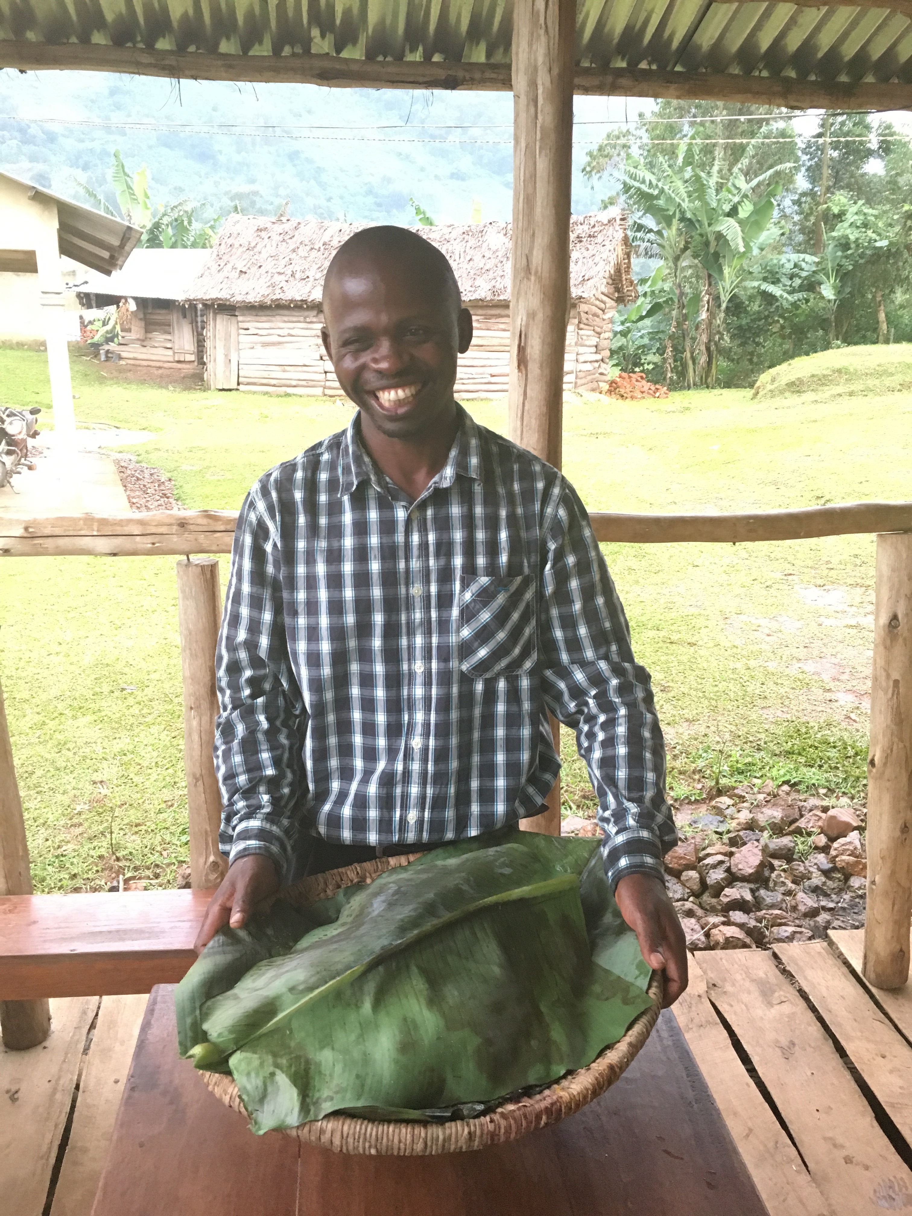 Wednesday afternoon we had a tour of CIBC – Community Initiatives for Biodiversity Conservation. It is run by a local guy who obtained a degree in agriculture and returned to set up a training centre. He is raising tilapia, pigs, and chickens and growing a wide range of fruits, vegetables, and oyster mushrooms as well as harvesting honey. It is particularly impressive when you realize his only farm vehicle is a motorbike, all his outbuildings are constructed without the benefit of power tools, and all the harvesting is done by hand. His goal is to teach farming to alleviate poverty, hunger and malnutrition. Some of his clients are single mothers and others are people who used to hunt in the forest and no longer can. We had supper there. Millet bread has a texture akin to dirt and the girls renamed it millet gloop but otherwise we enjoyed the eggplant, tilapia, mushroom, cabbage, potato and banana dishes. Stopping by the Bwindi Bar for brownies was an additional treat.