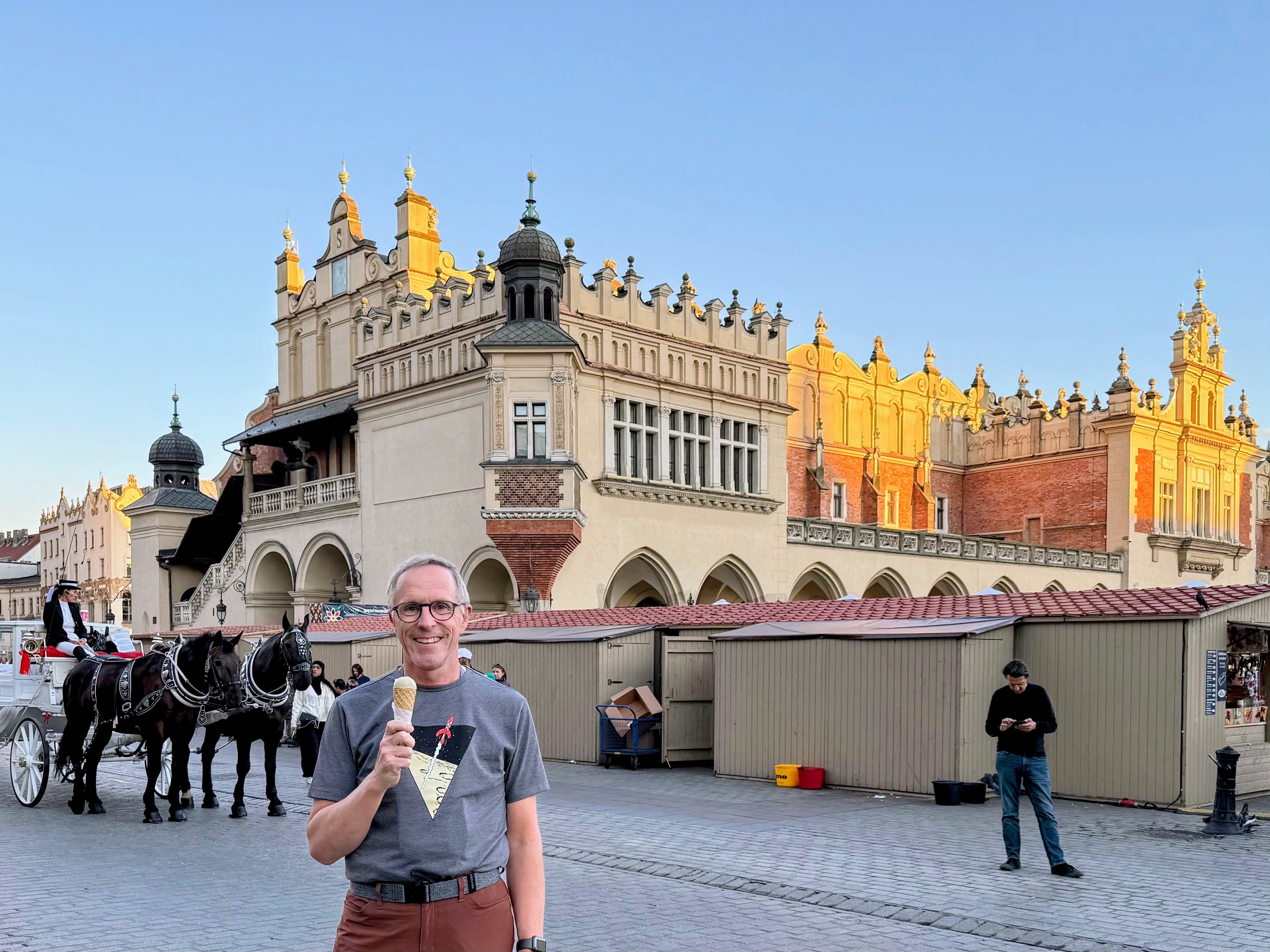 It was then back to the square to figure out where to recreate the ice cream photo of thirty years ago. And to decide we didn’t think the carved Jewish musician statues were our thing anymore.