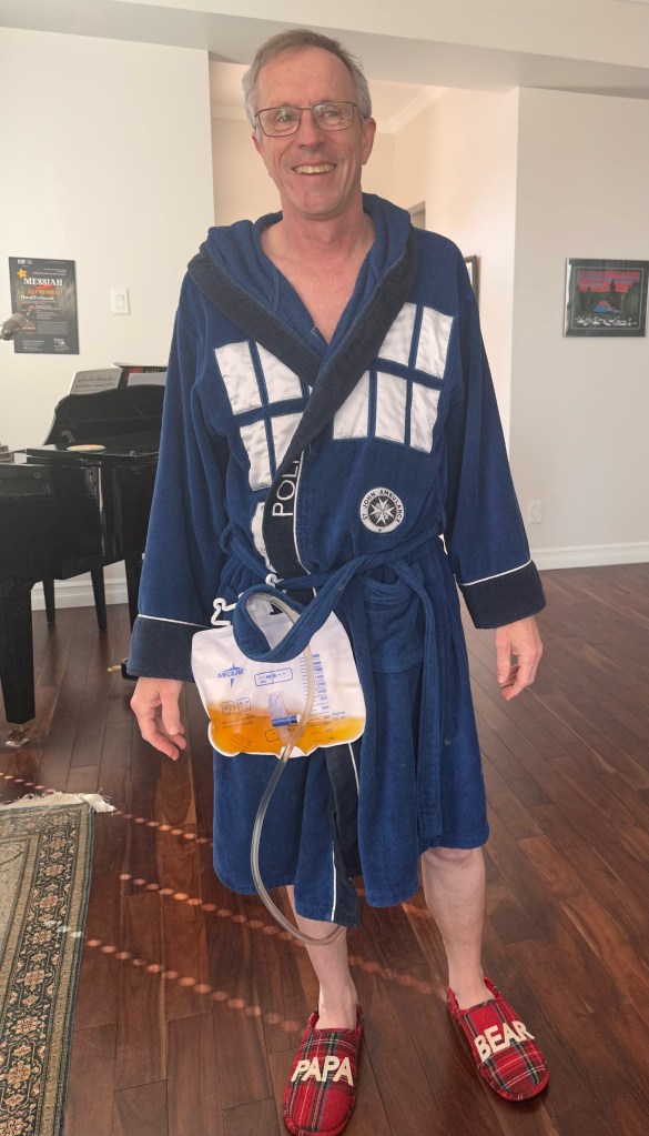 In April, Paul underwent a radical prostatectomy for prostate cancer. We found it rather surreal for him to be a patient in the Royal Inland Hospital where we met in 1989, esp. as the surgical ward has not altered much since Paul was there briefly as a medical student and Lori worked as a hospital pharmacist. Paul’s post-surgical recovery was mostly smooth (much of it spent in his TARDIS housecoat) (Fig. 1). However, he also had to undergo radiotherapy, which entailed being in Kelowna weekdays beginning Nov. 29 (and will continue to January 10).