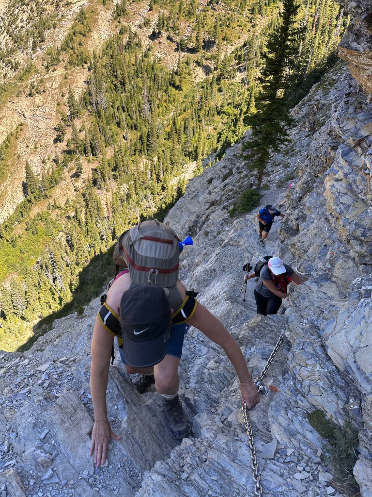 In August, we drove to Pincher Creek for Lori’s 40-year high school reunion. There was a solid turnout from our small class, including some parents, teachers, and siblings, and the reminiscing was entertaining. We caught up with family, stayed one night with friends in Waterton, and hiked the trail to Crypt Lake with Lori’s friend Angela (Lori overcoming her fear of heights to negotiate the chain and tunnel section). (Fig. 9)